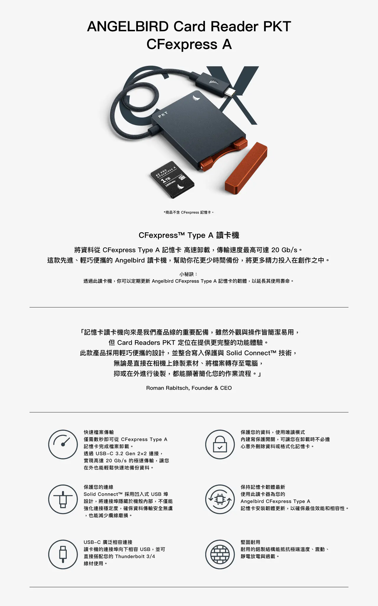 商城首頁 » ANGELBIRD 記憶卡 » ANGELBIRD Card Reader PKT CFexpress A 讀卡機 🔍 ANGELBIRD Card Reader PKT CFexpress A 讀卡機NT$3,630 20 Gb/s 高速傳輸,快速卸載 CFexpress Type A 記憶卡資料 Solid Connect™ 凹入式 USB-C 設計,穩定連線並防止磨損 內建寫保護開關,防止誤刪或格式化檔案 鋁合金外殼堅固耐用,抗震、防靜電並具防護性 ANGELBIRD Card Reader PKT CFexpress A 讀卡機 數量 加入購物車 分類: ANGELBIRD 記憶卡, 讀卡機 商品說明 額外資訊 商品性質 公司貨 售後服務 收到貨品後七日內如有瑕疵可接受退換貨,人為損壞恕不更換。 出貨時間 自結帳日起,如有現貨1-3天可送達,如需調貨最長需10-20個工作日寄達。 相關商品 ANGELBIRD AV PRO CF CFAST 2.0 記憶卡 NT$19,000 – NT$24,900價格範圍:NT$19,000 到 NT$24,900 選擇選項 此產品有多種款式。 可在產品頁面選擇選項 ANGELBIRD Card Reader PKT SD 讀卡機 NT$3,630 加入購物車 ANGELBIRD AV PRO CFEXPRESS TYPE A 記憶卡 NT$16,800 加入購物車 ANGELBIRD AV PRO SD MK2 V90 記憶卡 NT$3,250 – NT$21,800價格範圍:NT$3,250 到 NT$21,800 選擇選項 此產品有多種款式。 可在產品頁面選擇選項