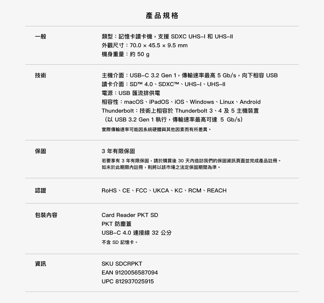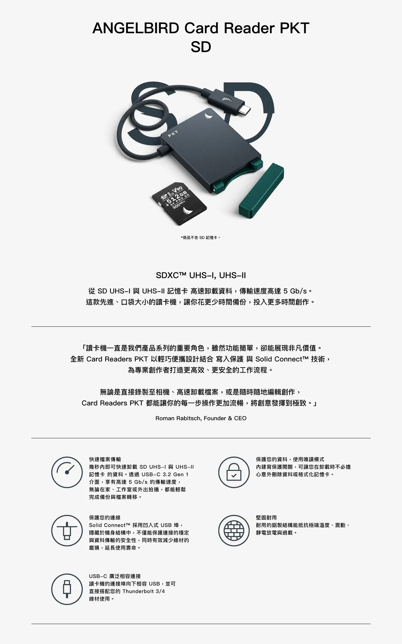 商城首頁 » ANGELBIRD 記憶卡 » ANGELBIRD Card Reader PKT SD 讀卡機 🔍 ANGELBIRD Card Reader PKT SD 讀卡機NT$3,630 高速傳輸:USB-C 3.2 Gen 1 介面,資料傳輸速度最高可達 5 Gb/s 雙規格支援:相容 SDXC™ UHS-I / UHS-II 記憶卡,滿足各類拍攝需求 耐用設計:鋁合金外殼結構,具抗震、防靜電與優異散熱性能 安全防護:內建 Write-Protect 寫入保護開關,防止誤刪與資料損毀 ANGELBIRD Card Reader PKT SD 讀卡機 數量 加入購物車 分類: ANGELBIRD 記憶卡, 讀卡機 商品說明 額外資訊 商品性質 公司貨 售後服務 收到貨品後七日內如有瑕疵可接受退換貨,人為損壞恕不更換。 出貨時間 自結帳日起,如有現貨1-3天可送達,如需調貨最長需10-20個工作日寄達。 相關商品 ANGELBIRD AV PRO CFEXPRESS TYPE A 記憶卡 NT$16,800 加入購物車 ANGELBIRD AV PRO CFEXPRESS MK2 TYPE B 記憶卡 NT$34,200 – NT$64,200價格範圍:NT$34,200 到 NT$64,200 選擇選項 此產品有多種款式。 可在產品頁面選擇選項 ANGELBIRD AV PRO CF CFAST 2.0 記憶卡 NT$19,000 – NT$24,900價格範圍:NT$19,000 到 NT$24,900 選擇選項 此產品有多種款式。 可在產品頁面選擇選項 ANGELBIRD CFEXPRESS CARD READER MK2 | TYPE B 讀卡機 NT$3,250 加入購物車
