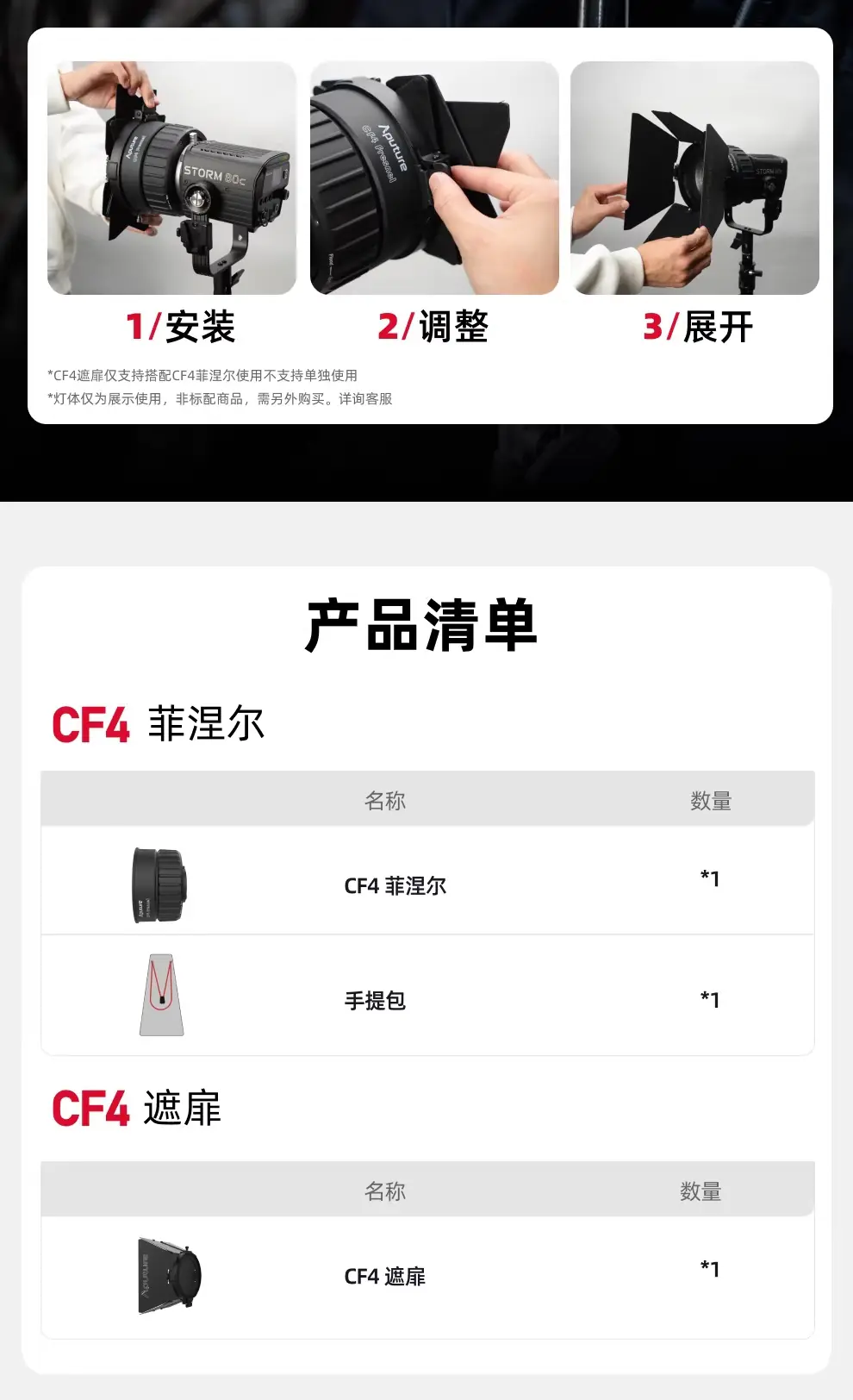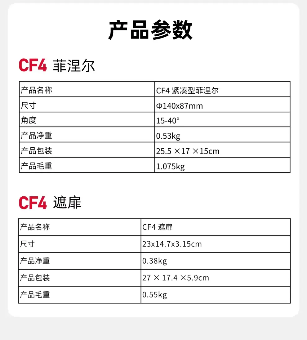 | 選項 | CF4 Fresnel 佛式透鏡, CF4 Barn Doors 八葉片 |