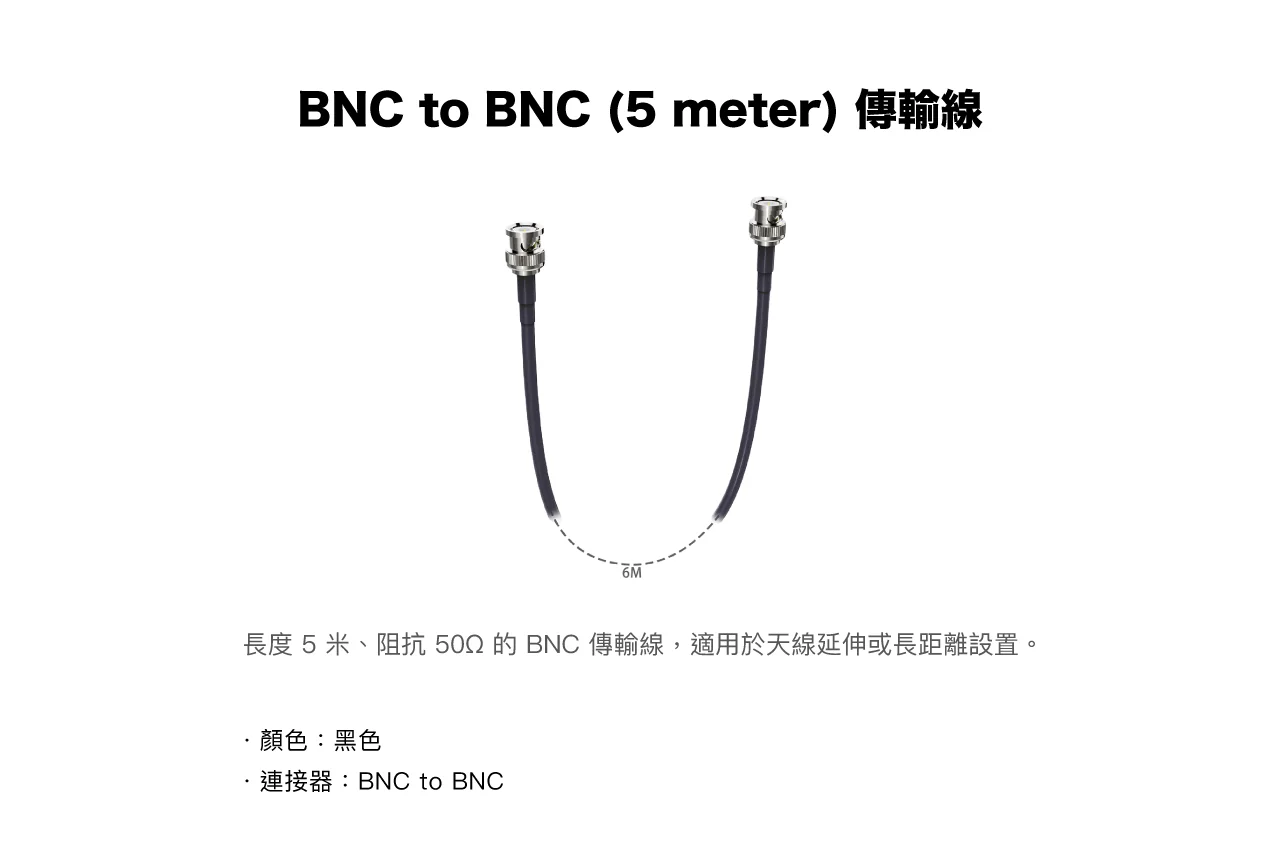 DEITY BNC to BNC (5 m) 傳輸線 採用 50 Ω 專業射頻同軸電纜,兩端配備標準 BNC 直插式接頭,長度為約 5 公尺(16.4 英尺),非常適合用於天線桿裝設或需要較長訊號傳輸距離的無線音訊系統。