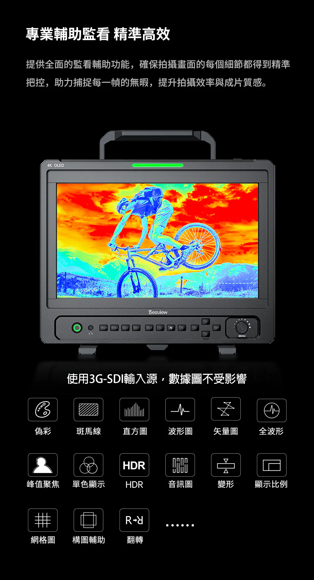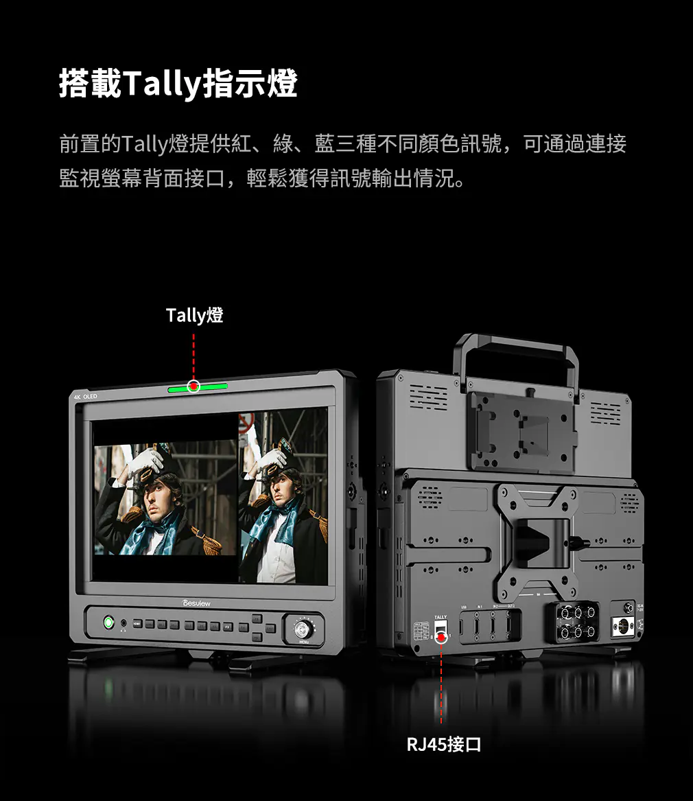 支援Tally、時間碼、波形圖、向量示波器、直方圖、音訊表、HDR、色彩空間