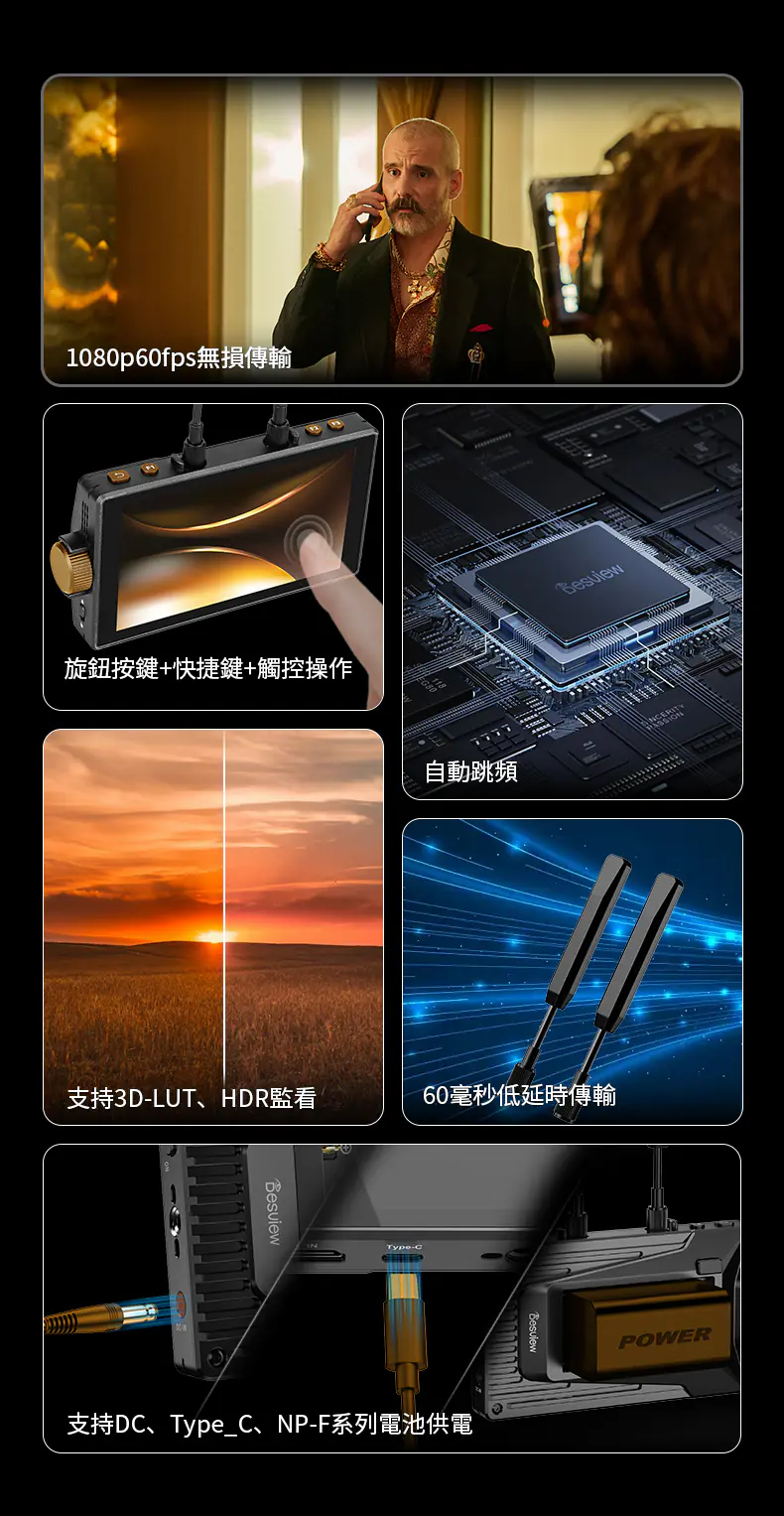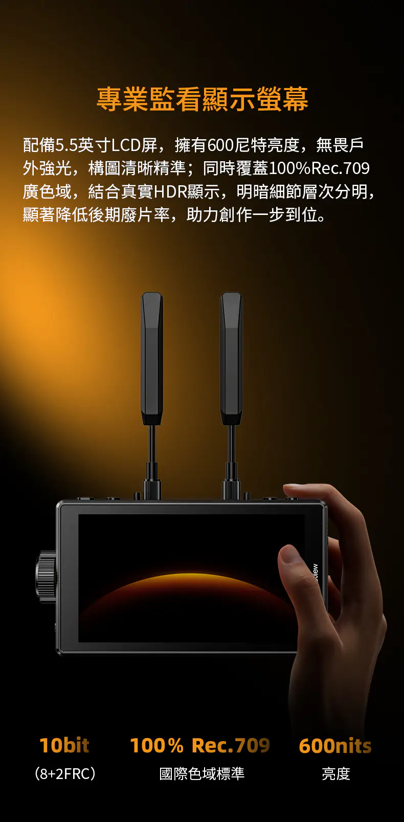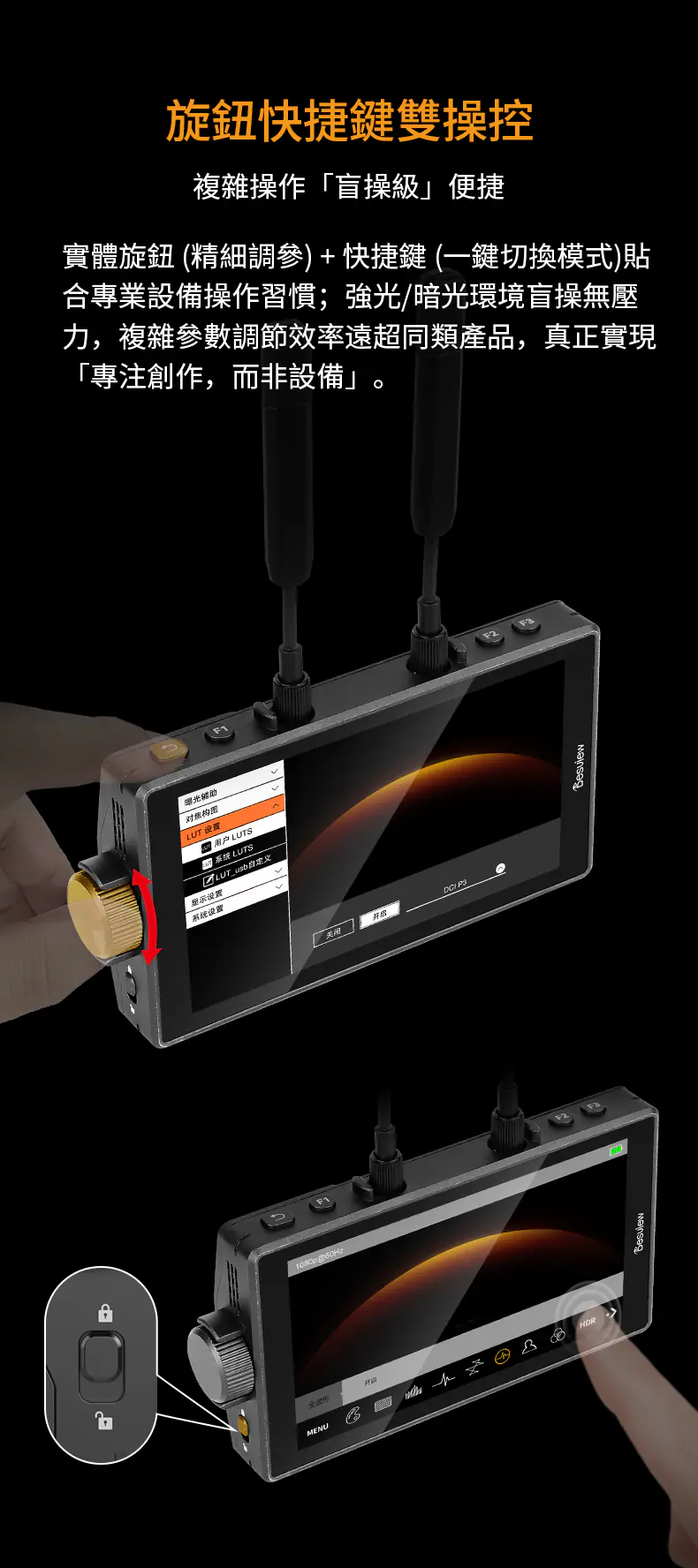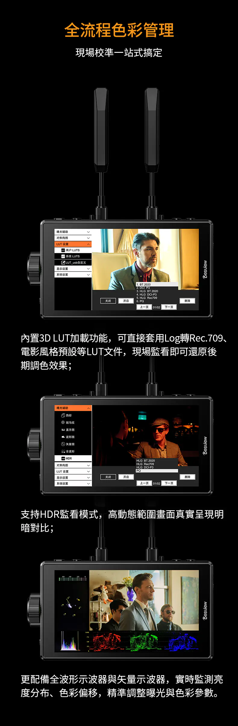 內建 3D LUT(如 Log 轉 Rec.709),可現場還原調色效果