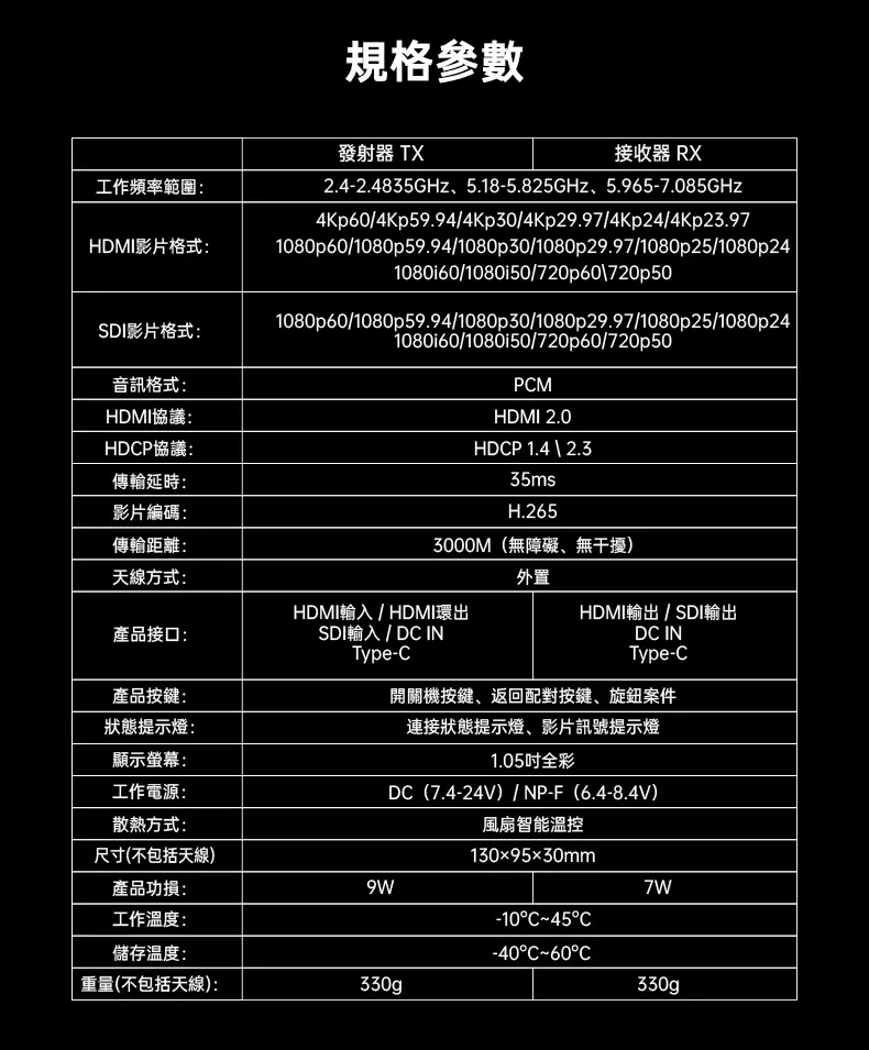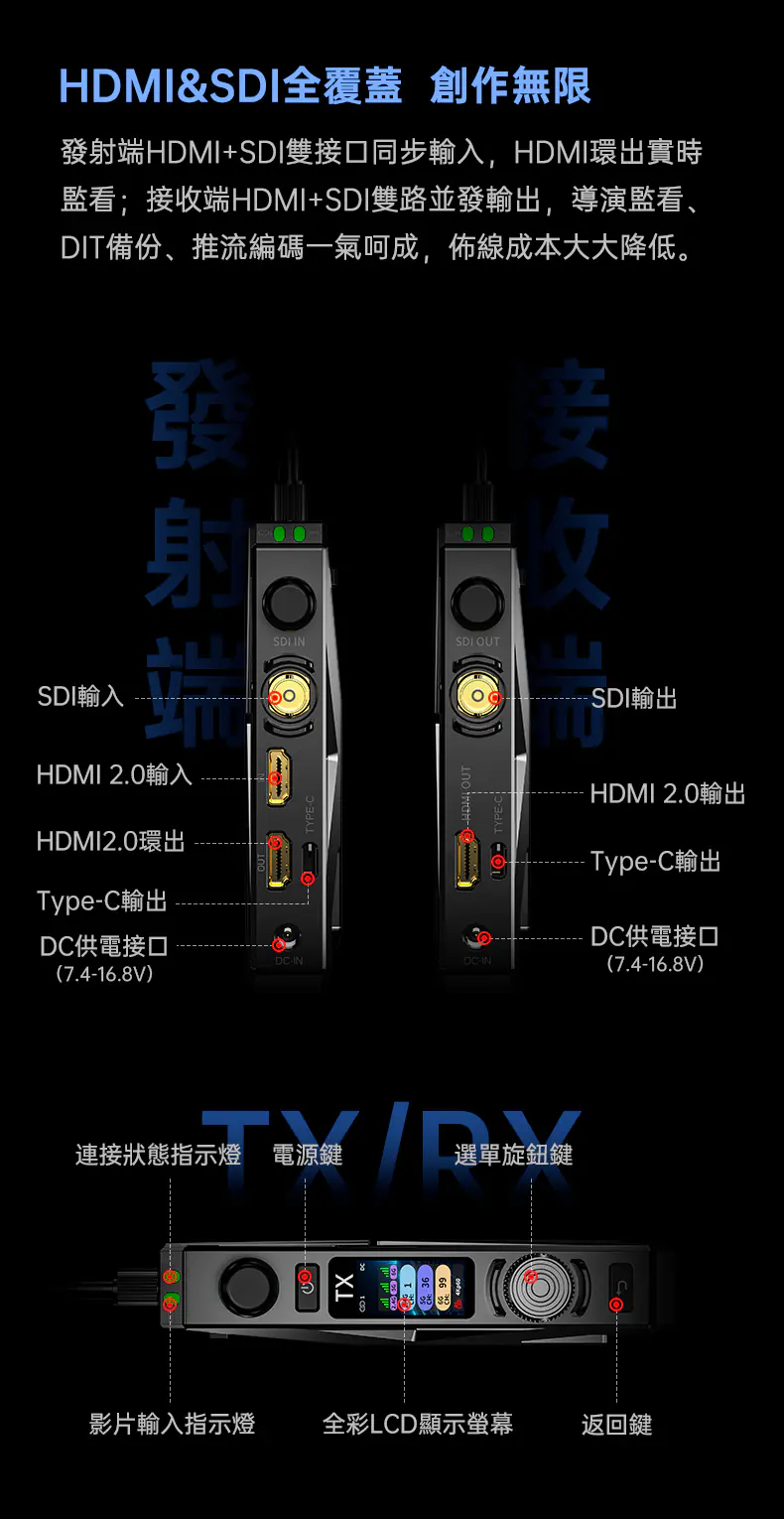 產品介面:HDMI 輸入 / HDMI 環出、3G-SDI 輸入 / DC IN、