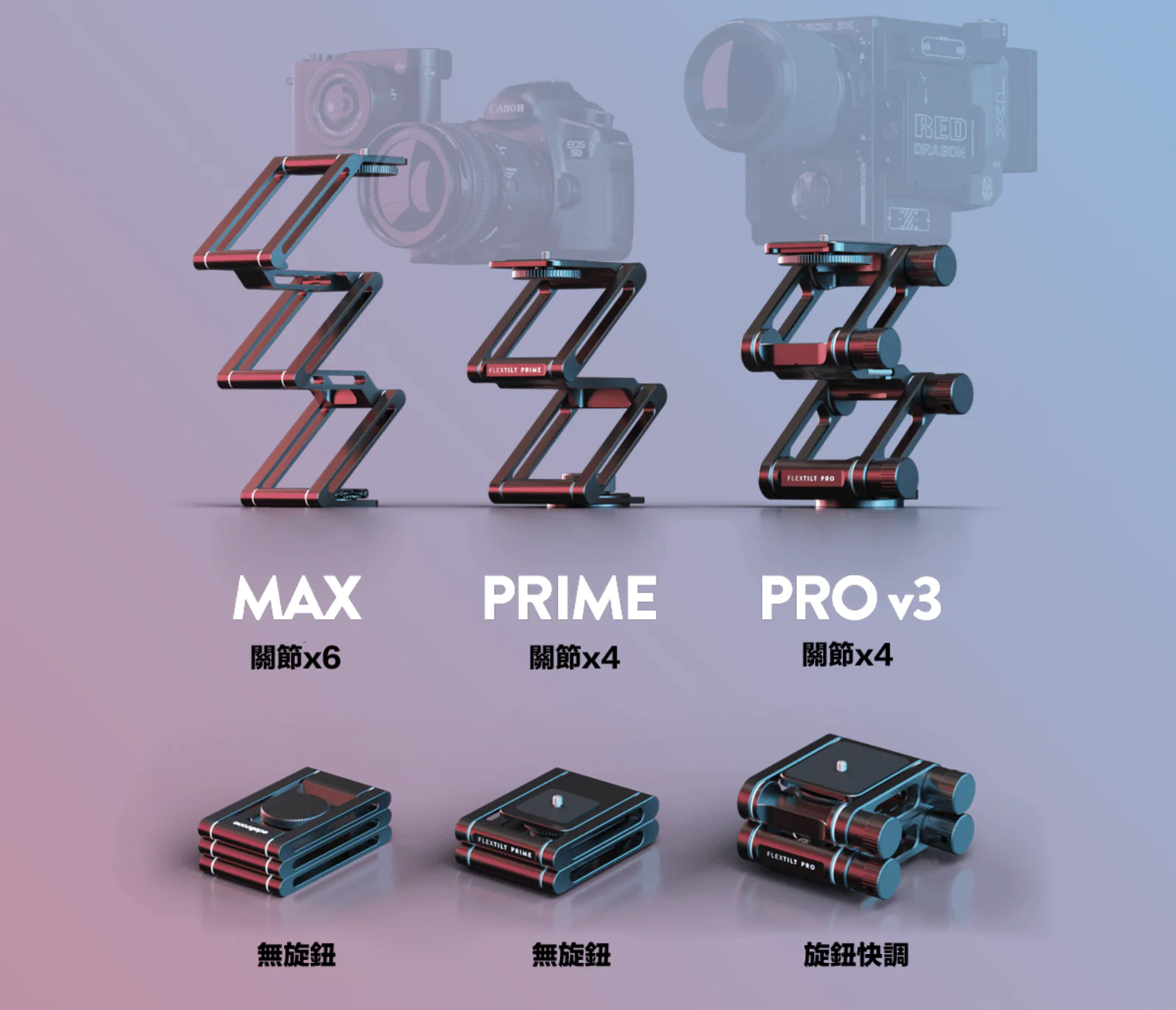 MAX:專為輕型無反光鏡相機和手機而設計,具該系列雲台中最長的延伸範圍。