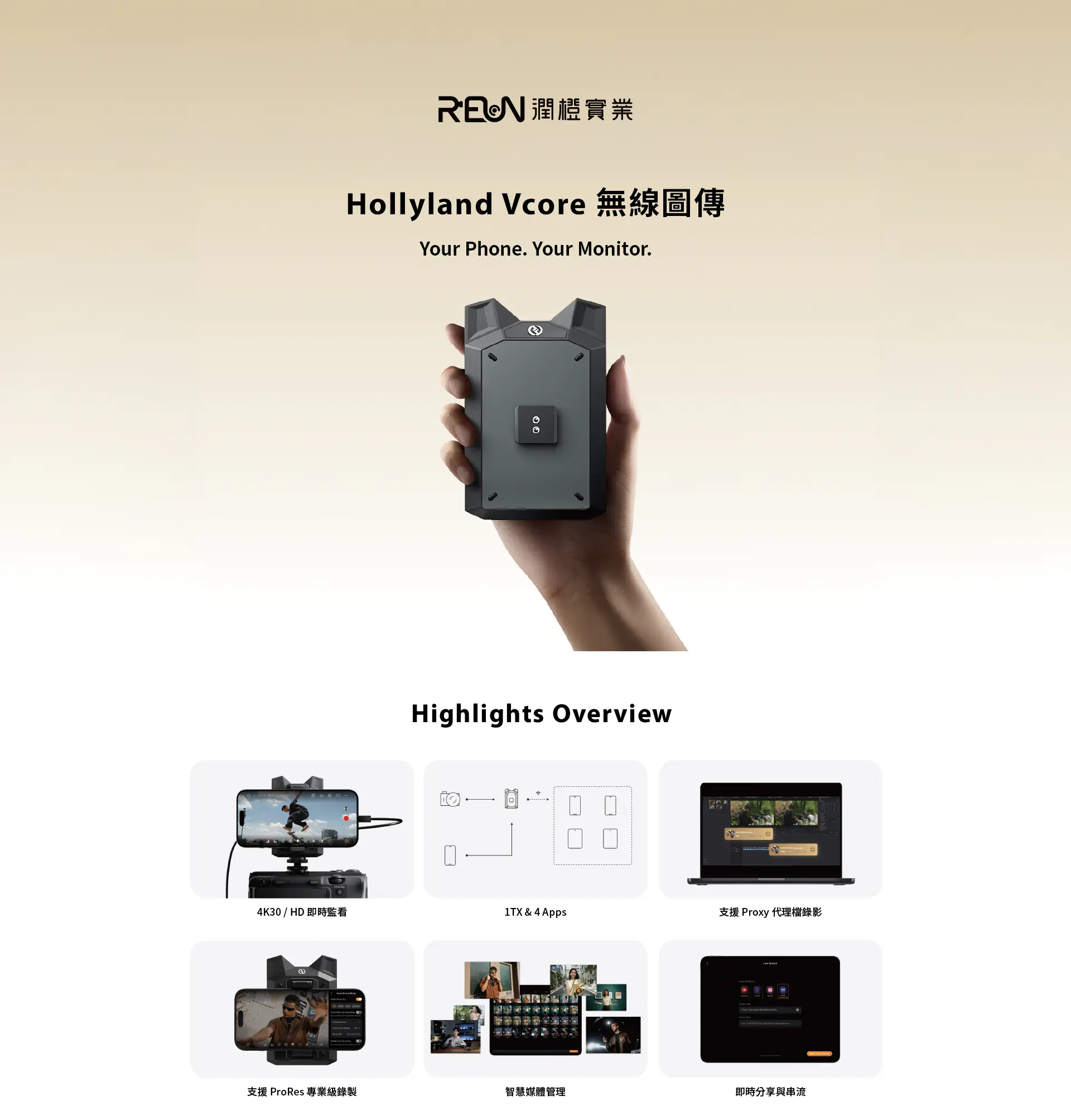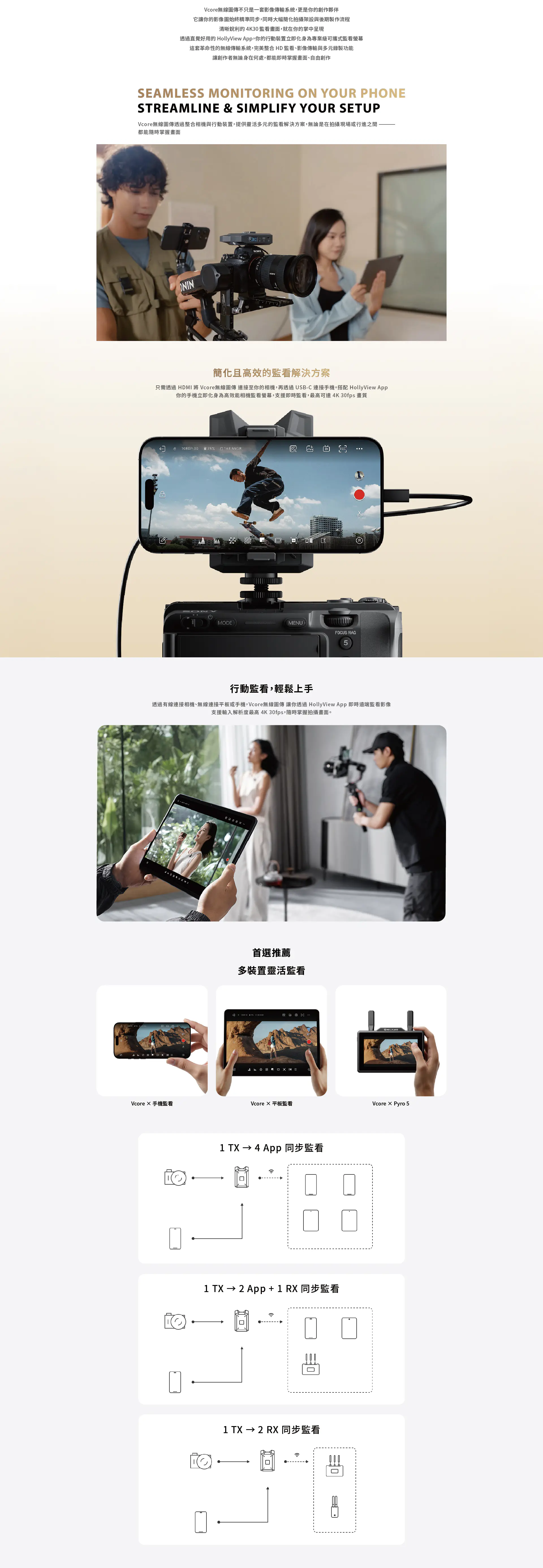 Vcore無線圖傳不只是一套影像傳輸系統,更是你的創作夥伴!它讓你的影像圖始終精準同步,同時大幅簡化拍攝架設與後期製作流程,清晰銳利的4K30監看畫面,就在你的掌中呈現。