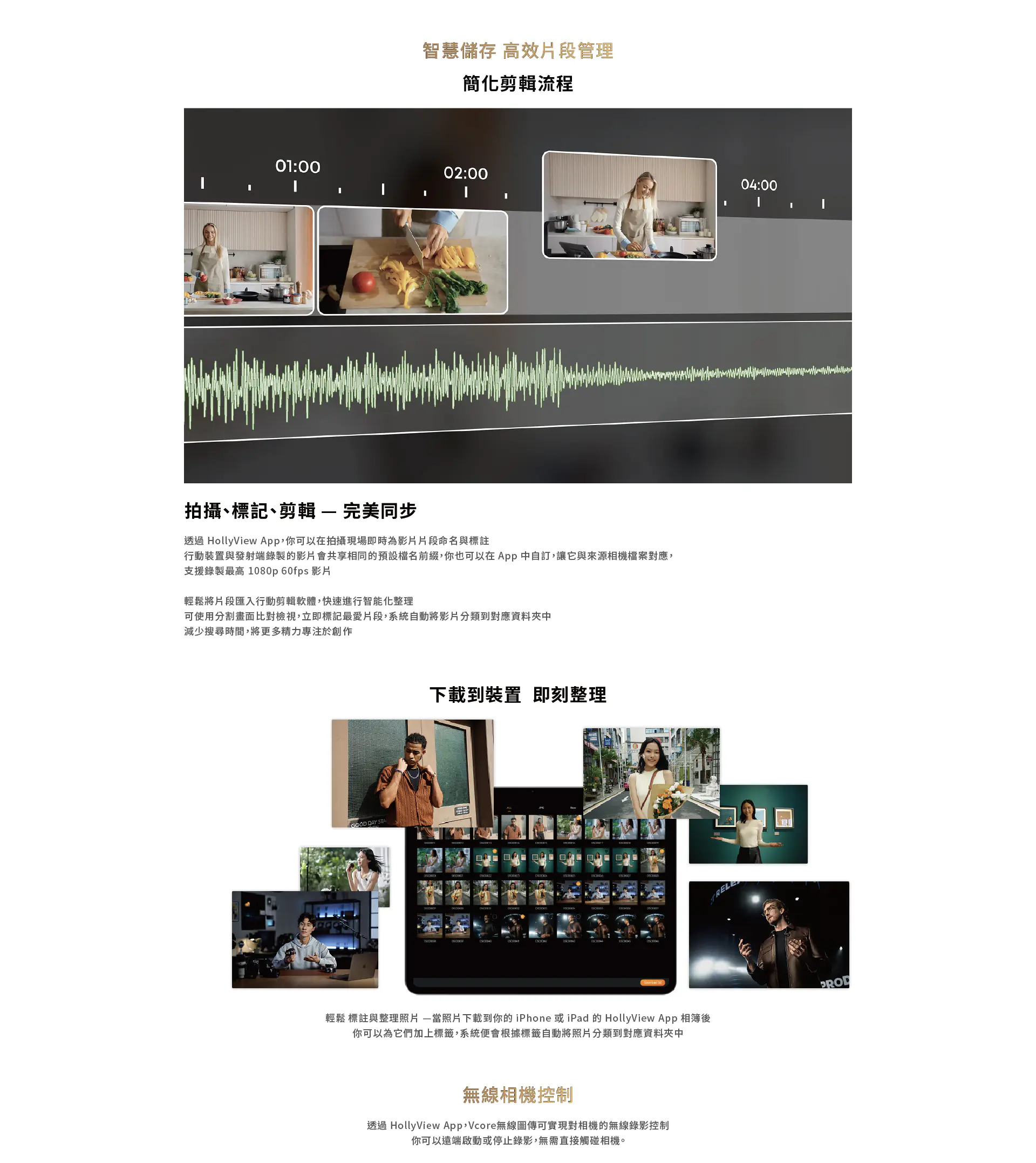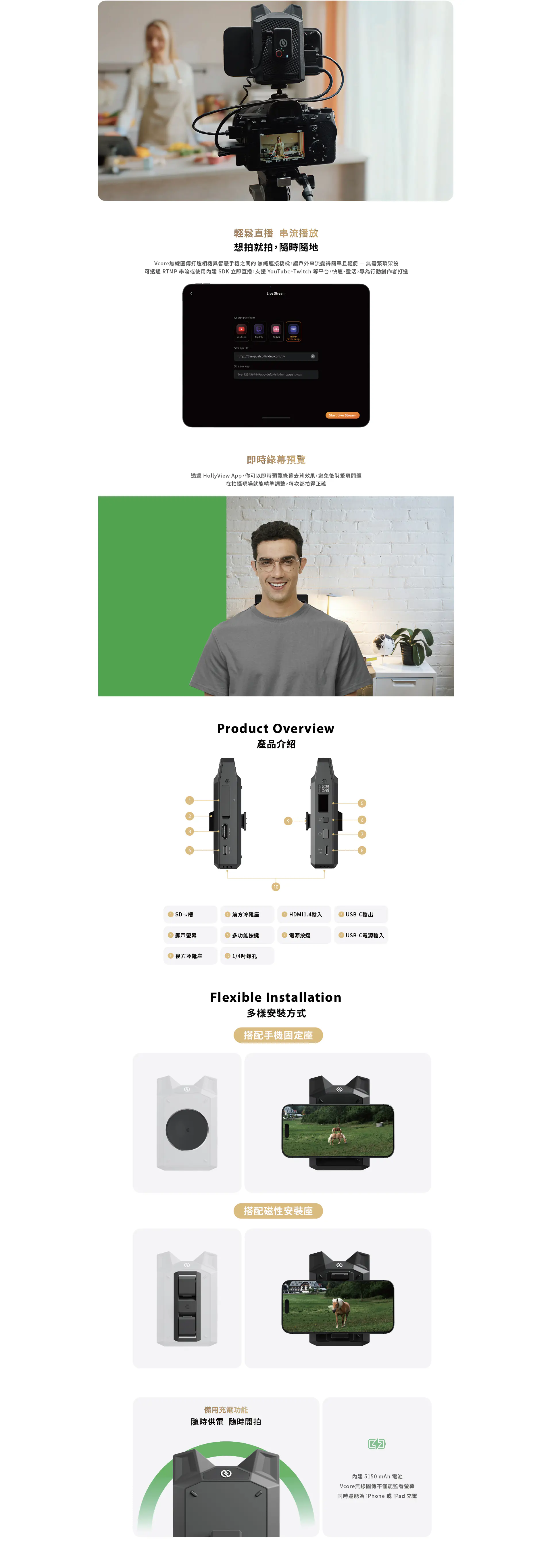 透過直覺好用的 HollyView App,你的行動裝置立即化身為專業級可攜式監看螢幕這套革命性的無線傳輸系統,完美整合 HD 監看、影像傳輸與多元錄製功能讓創作者無論身在何處,都能即時掌握畫面、自由創作。